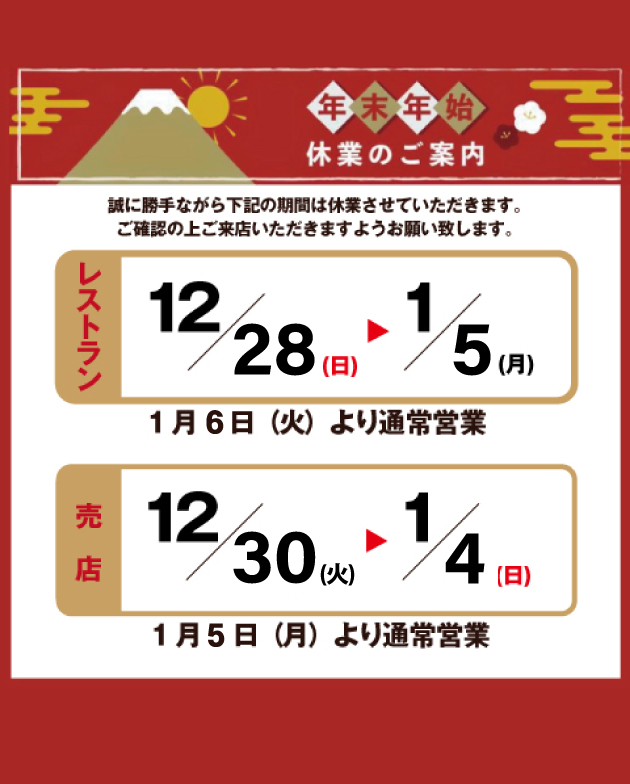 カレンダーでもお知らせしておりましたが、年末年始の営業につきましてご案内させていただきます。