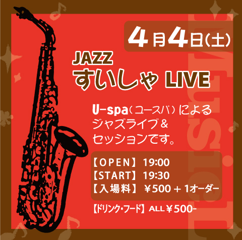 偶数月は「U-spa」(ユースパ)によるジャズライブ&セッション、奇数月はジャンルを問わないライブです。(1月・5月はお休みです)