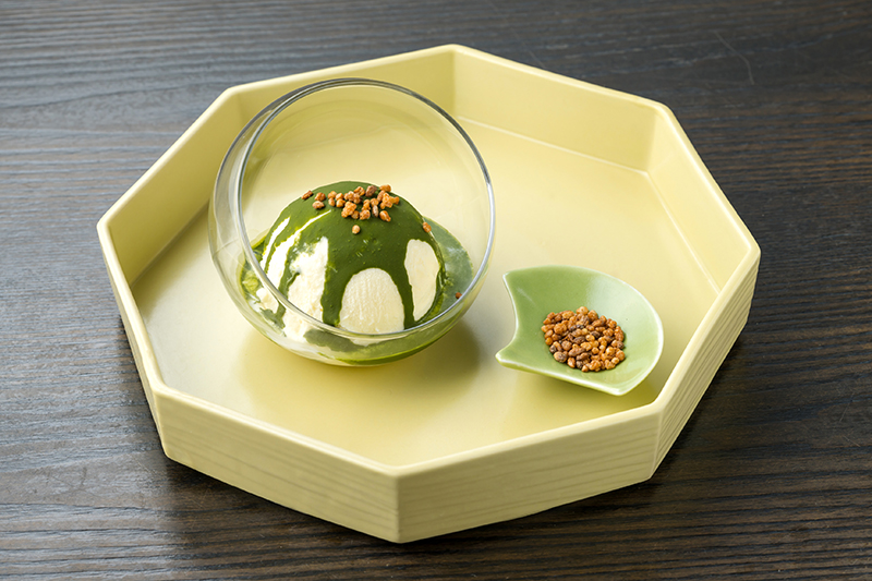 自社工場で製粉したもち粉を使用したお団子は、もちもちの食感です。抹茶アイス、つぶあんに黒みつをかけてお召し上がりください。