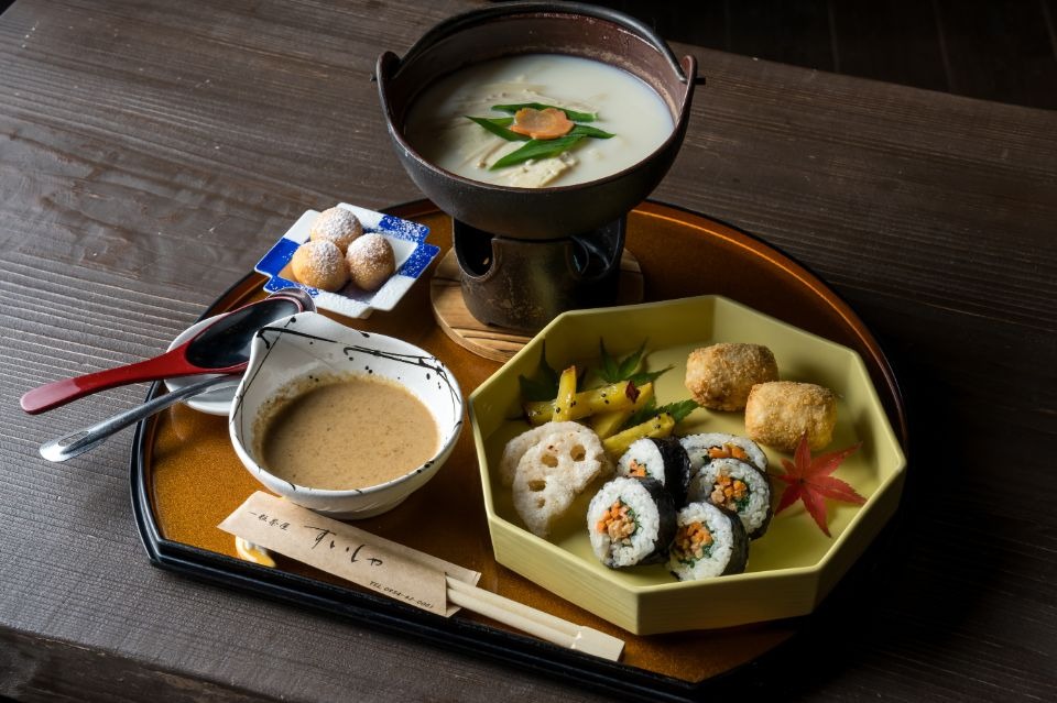 嬉野名物の湯どうふは、とろりとしたとろける食感が特徴です。嬉野産大豆「フクユタカ」を使った豆腐に、うどんと野菜も入っています。甘めの特製ごまだれでお召し上がりください。